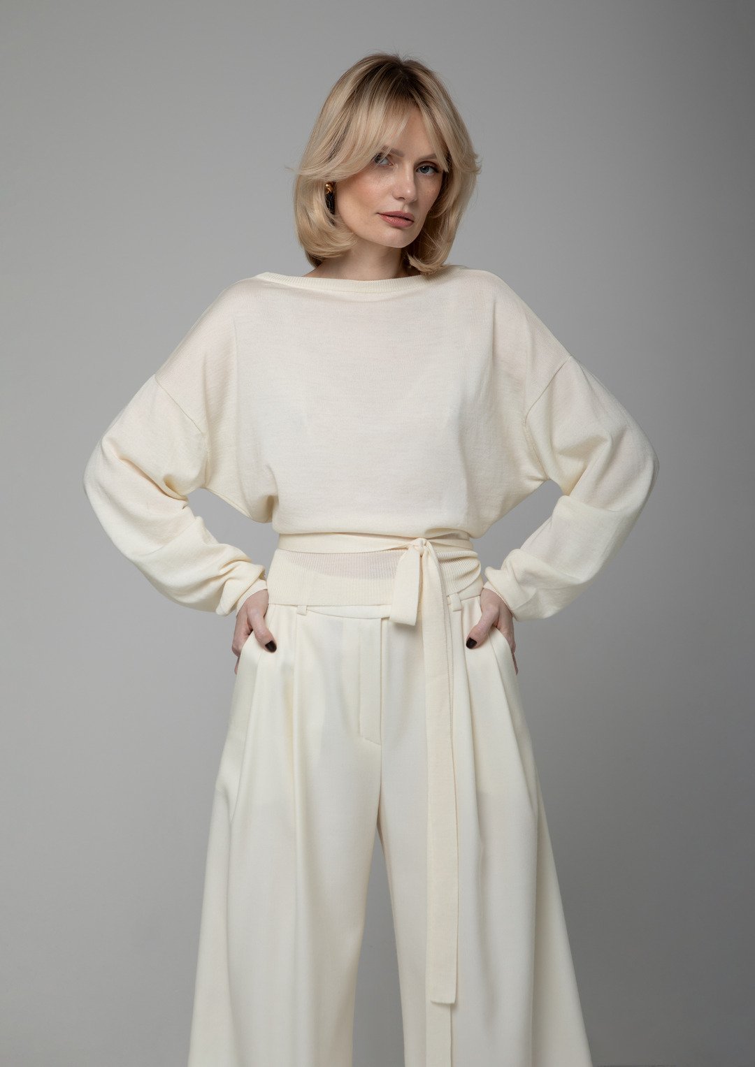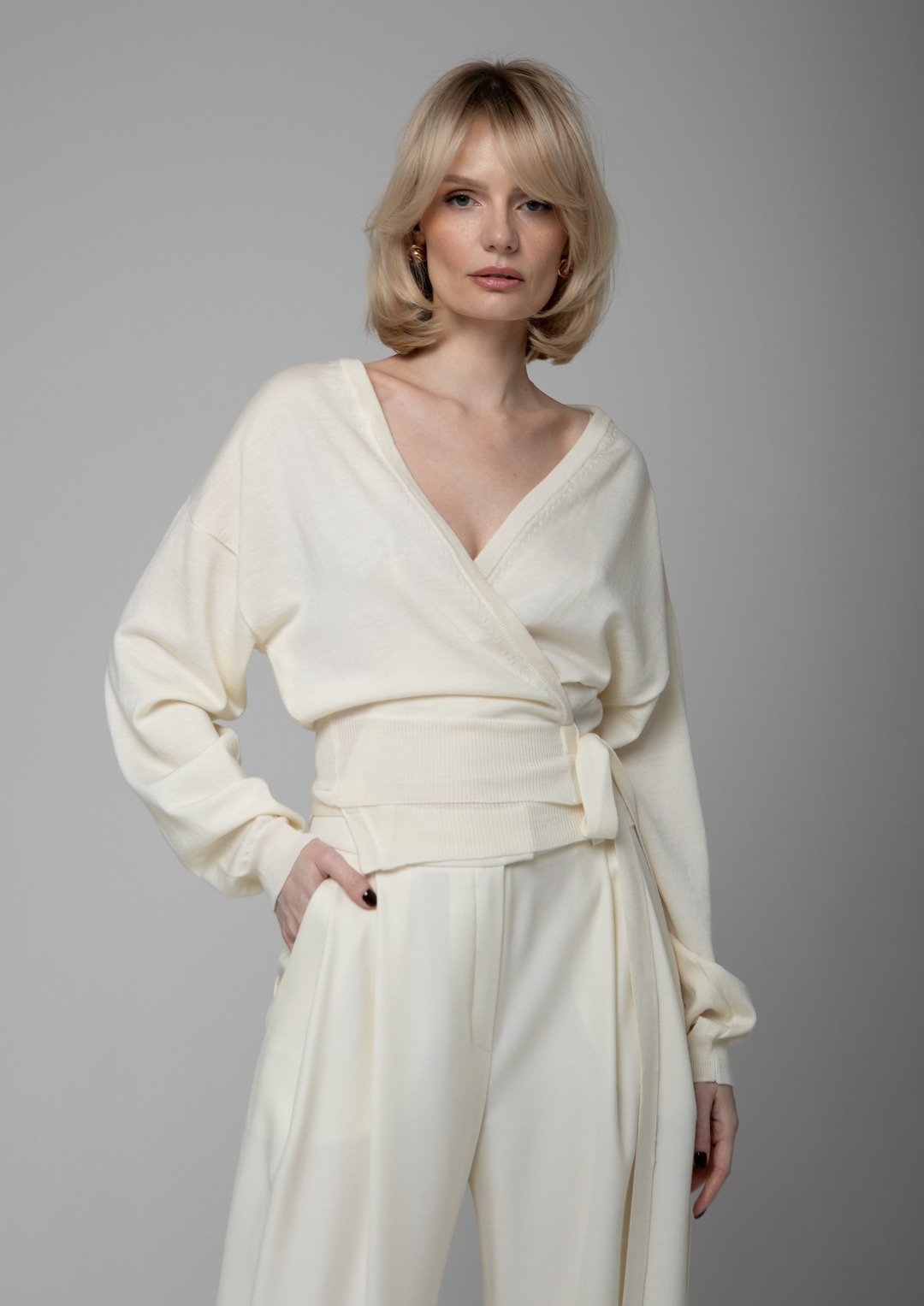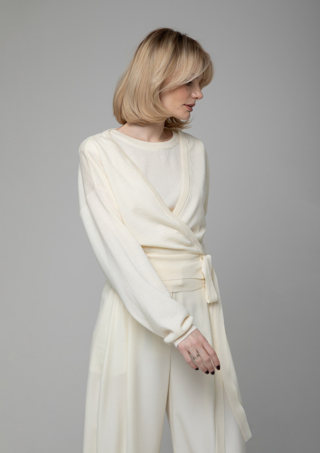 Trumpas, surišamas per juosmenį diržu, su prailgintomis rankovėmis, jis glotniai priglunda prie odos, suteikdamas merino vilnos švelnumo ir jaukumo pojūtį.