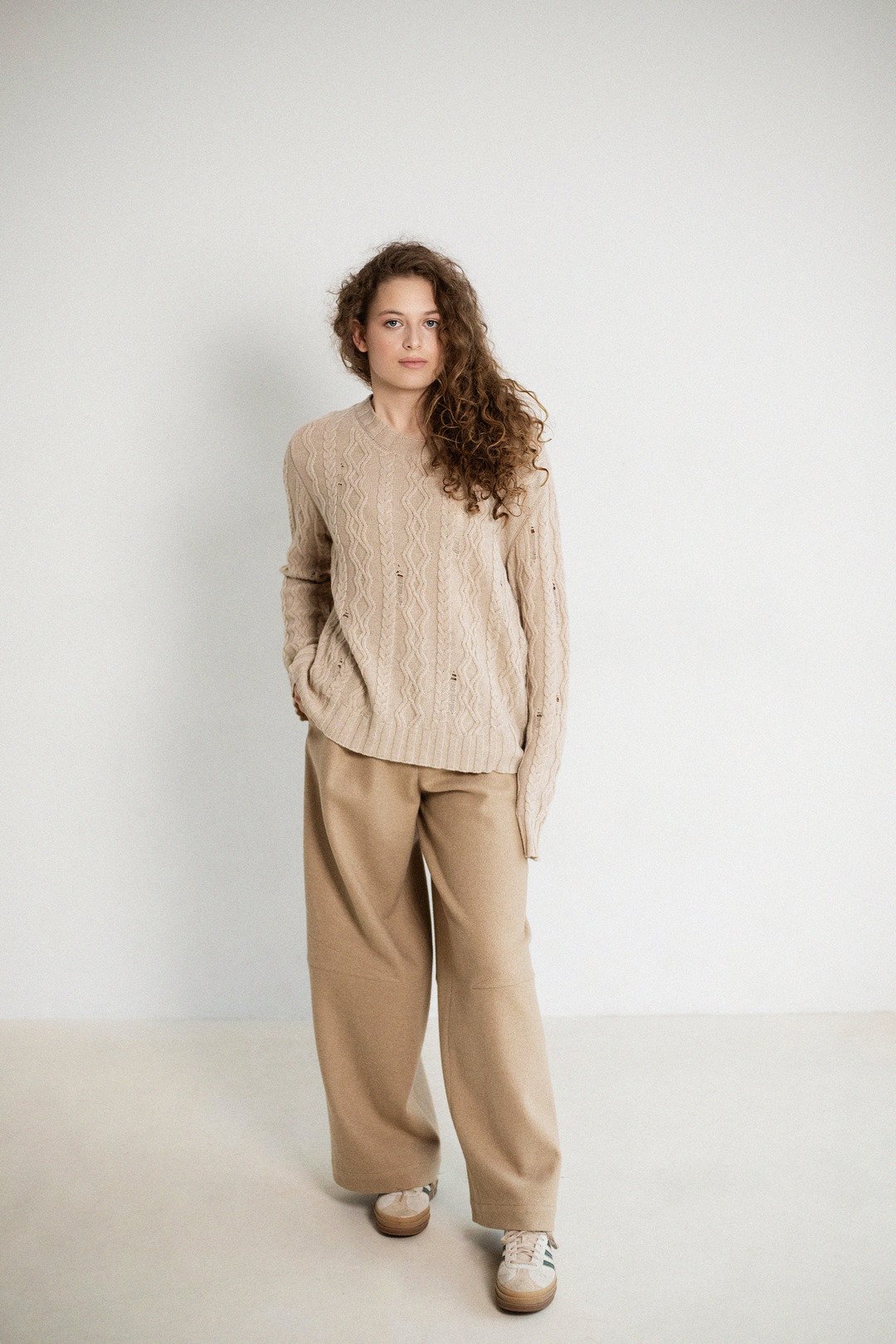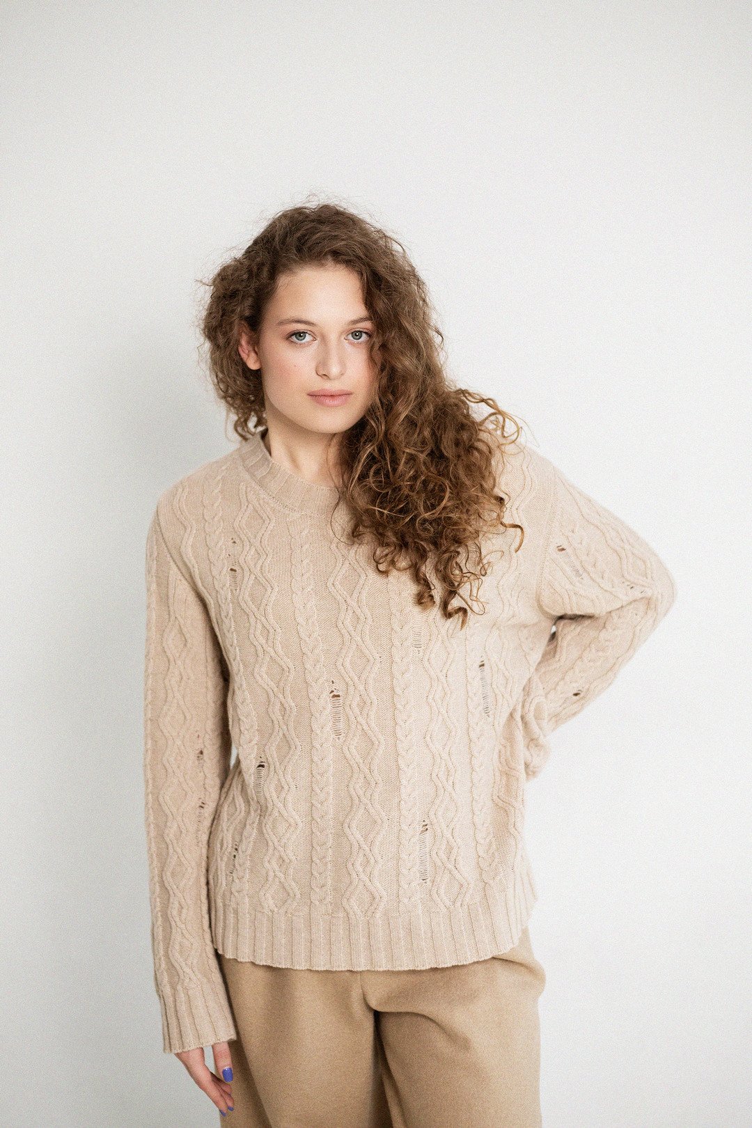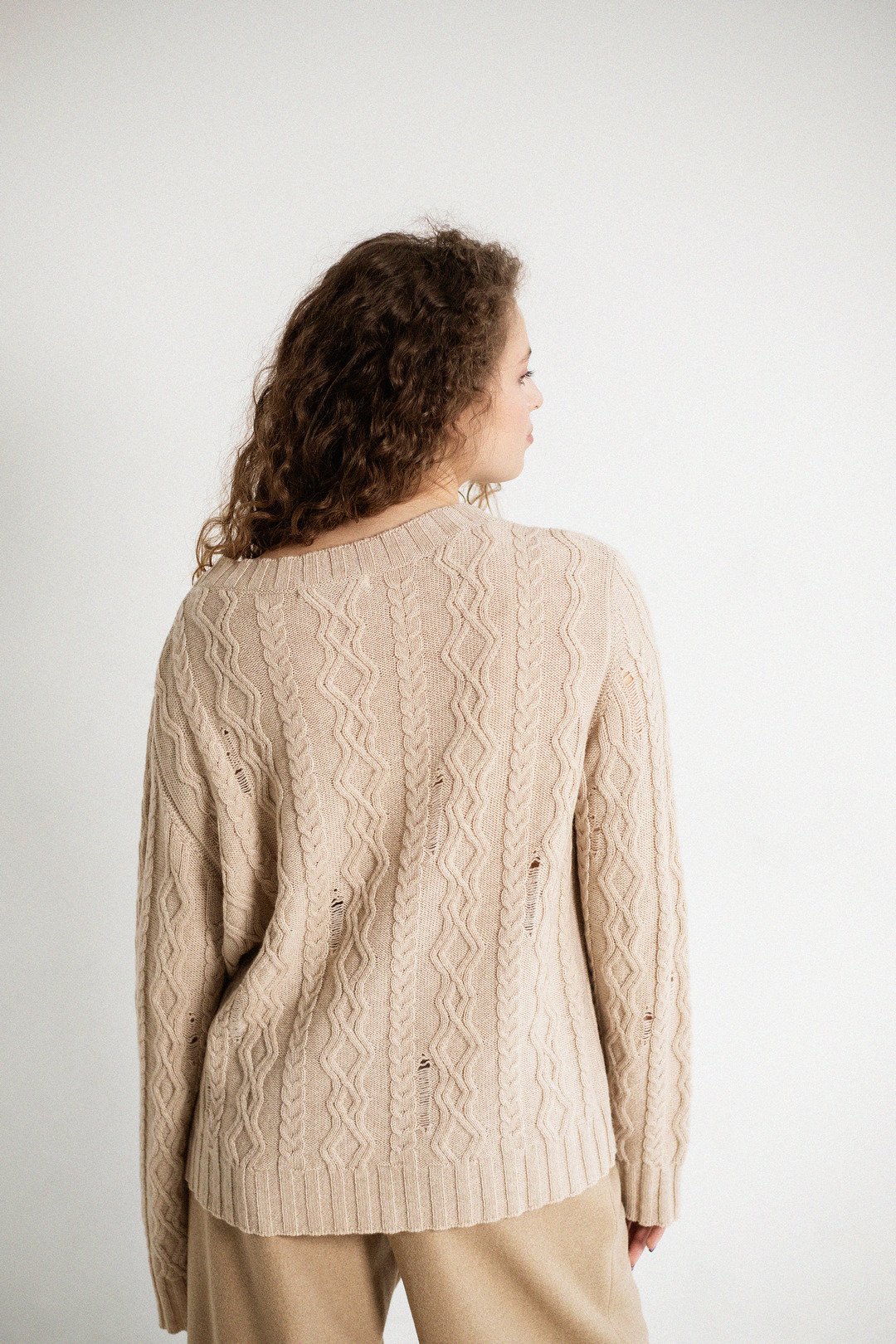 COUNTRY kašmyro megztinis su subtiliomis pynėmis ir plėšytais akcentais lengvai derės prie įvairių aprangos stilių.