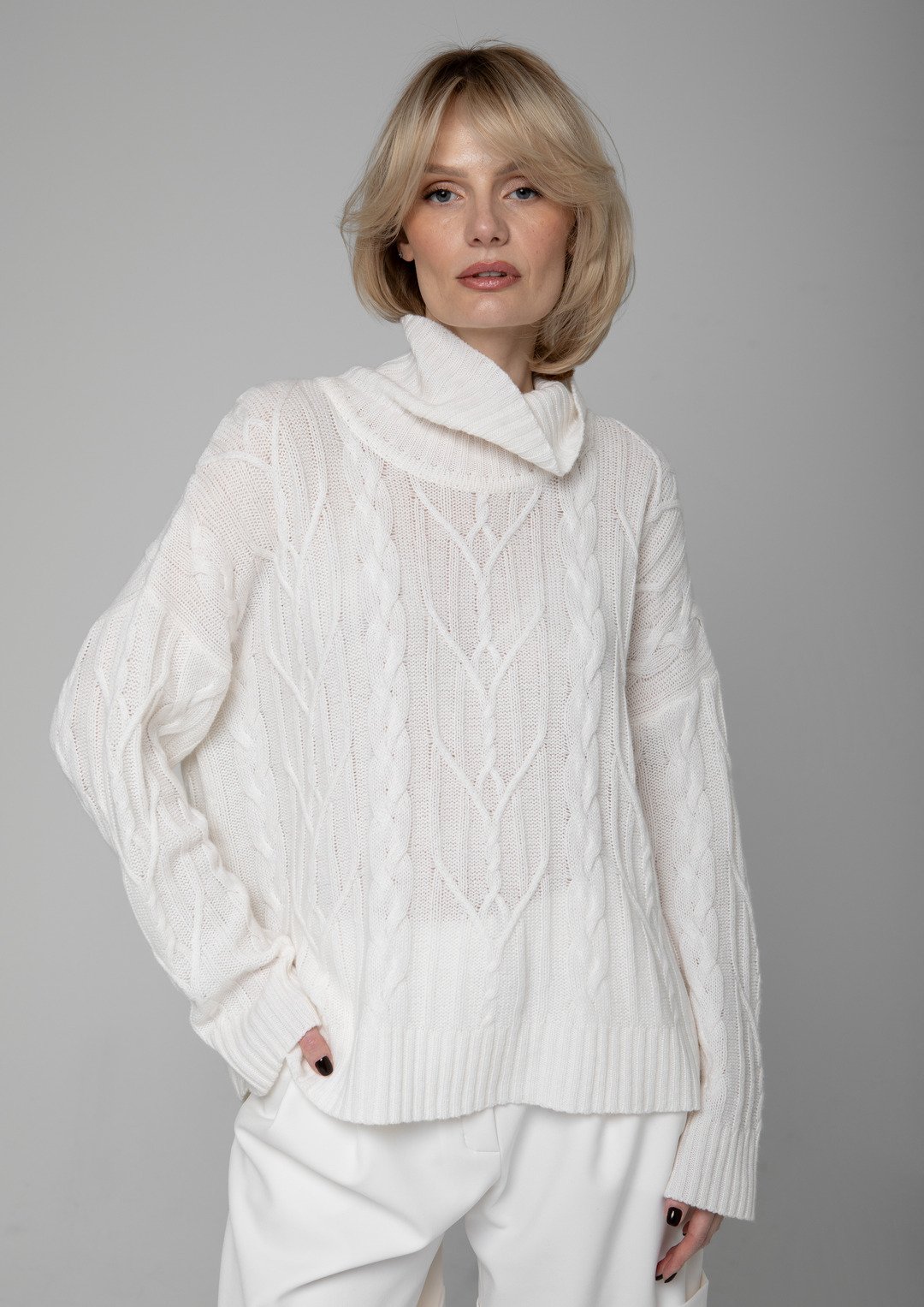 Pagamintas iš 100% kašmyro, jis spinduliuoja subtilia elegancija, kurią išryškina klasikinės pynės ir plono siūlo mezgimas. Laisvas siluetas prisitaiko prie kūno judesių, suteikdamas visišką komfortą, o stovė gali būti dėvima tiek atlenkta, tiek užlenkta, nevaržant kaklo.