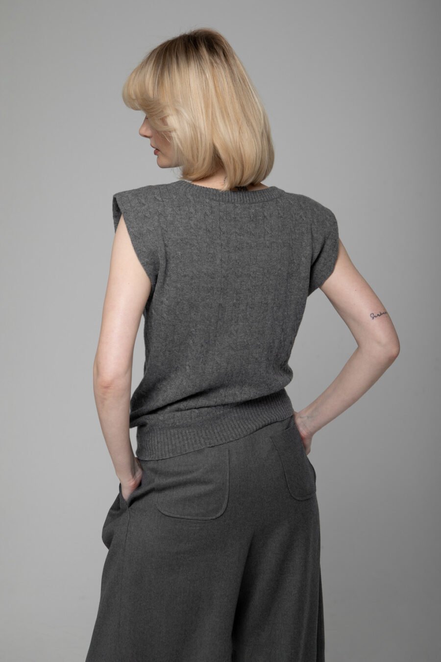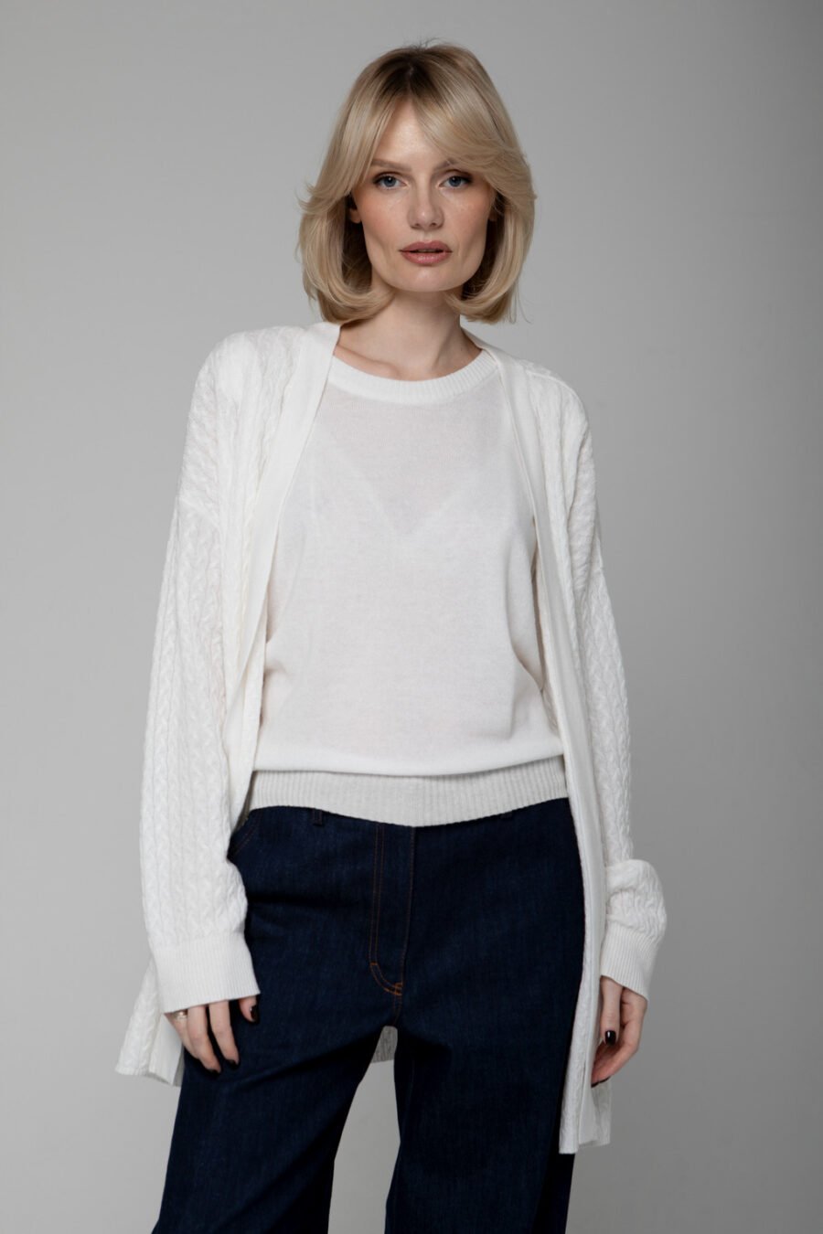 Plono siūlo, minimalistinio rašto, megzta gerosiomis akimis, su moderniais statesniais pečiais – ji yra universali ir elegantiška.