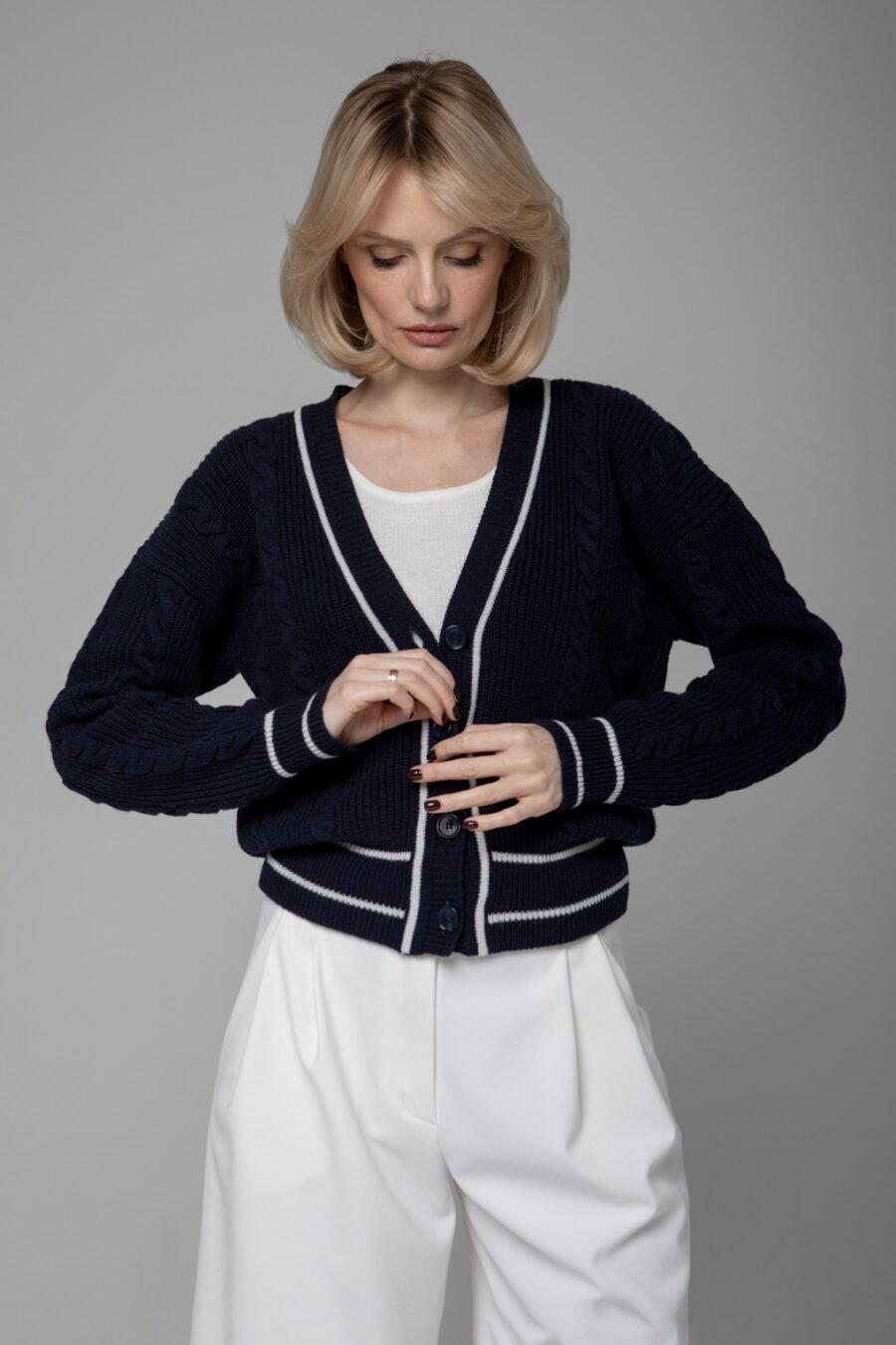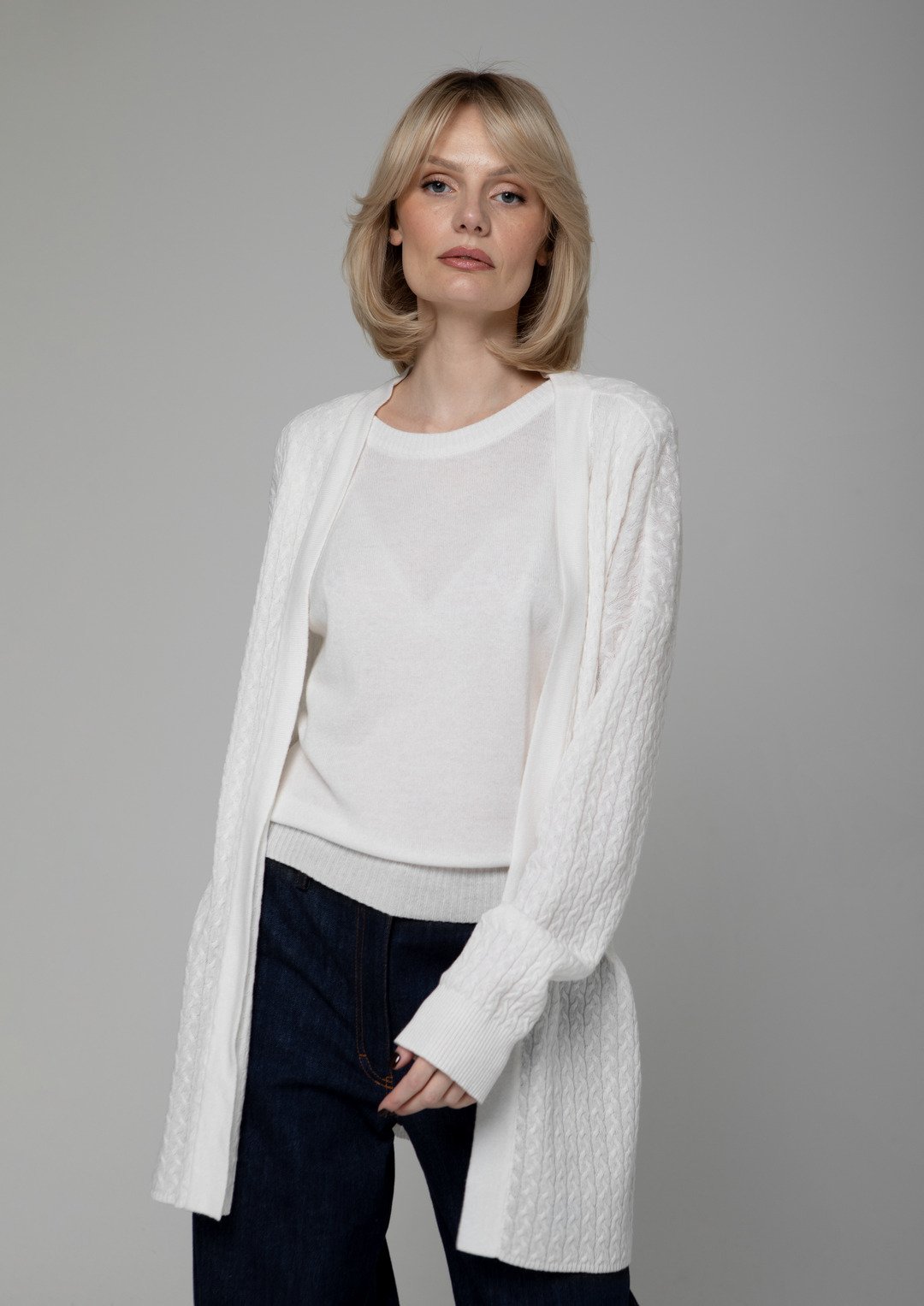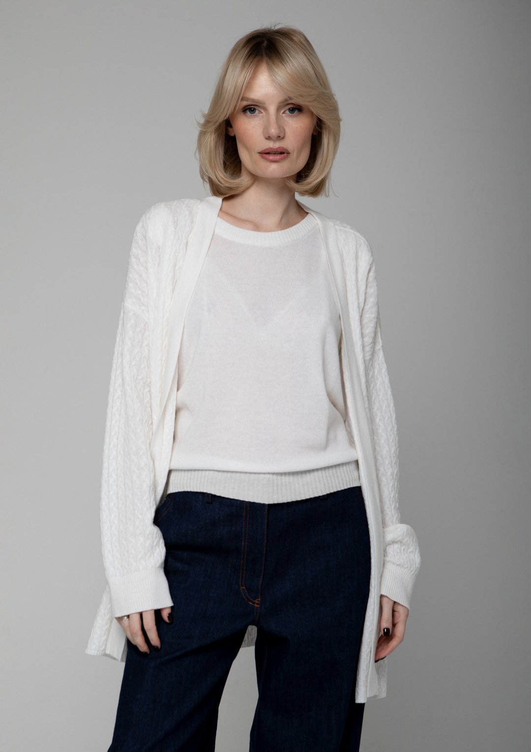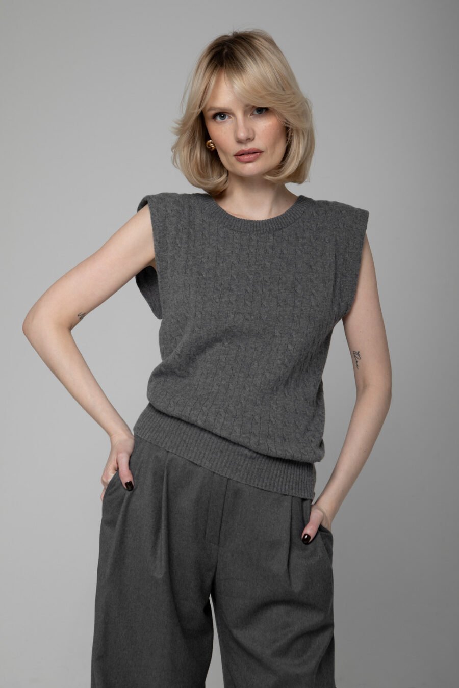 Plono siūlo, minimalistinio rašto, megzta gerosiomis akimis, su moderniais statesniais pečiais – ji yra universali ir elegantiška.